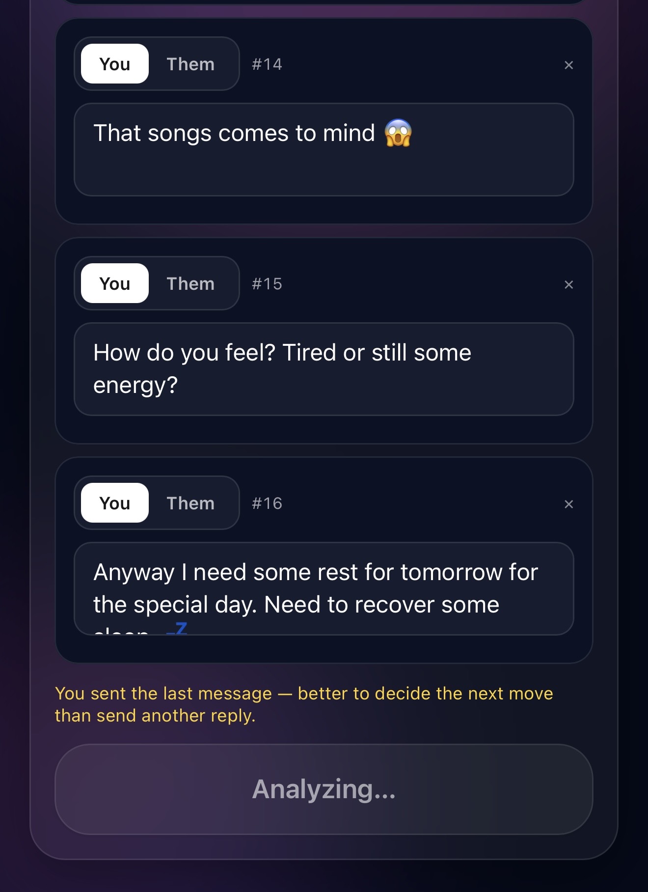 SparkText is build around momentum. It doesn't only aim for "a good line", it aims for "the next best move". That can mean: asking a question that unlocks more context, shifting tone from playful to direct, creating a simple plan or not texting at all if pushing would hurt the vibe. Pro plan give you more control over that "next move" like choosing how forward you want to be and how quickly you want to progress.
