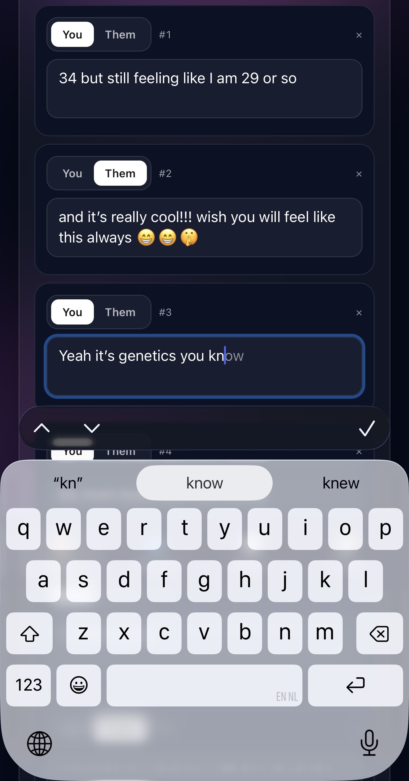 You choose the vibe + goal, and you can always tweak replies (shorter, funnier, more direct, less intense) so you get the replies that you want to use for your chats.